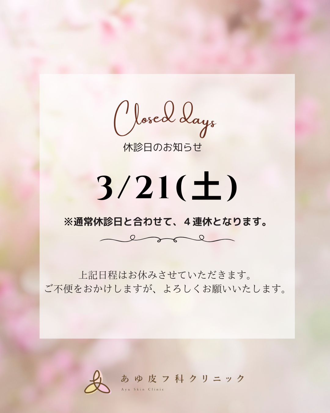 3月21日(土)はお休みさせていただきます。